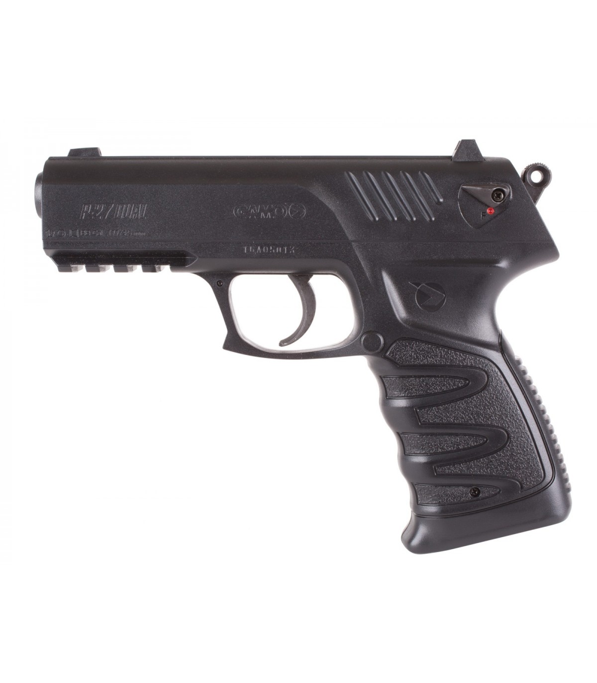 Gamo P-27 Dual Pellet/BB Air Pistol CO2 powered, 12g cartridge Semiautomatic Repeater Reversible, 16rd rotary BB and pellet magazine Shoots pellets and BBs Single/Double action Rifled barrel Fixed blade front sight Fixed notch rear sight Double/Single action Weaver rail under barrel for tactical flashlight or laser All-weather, ergonomic grip