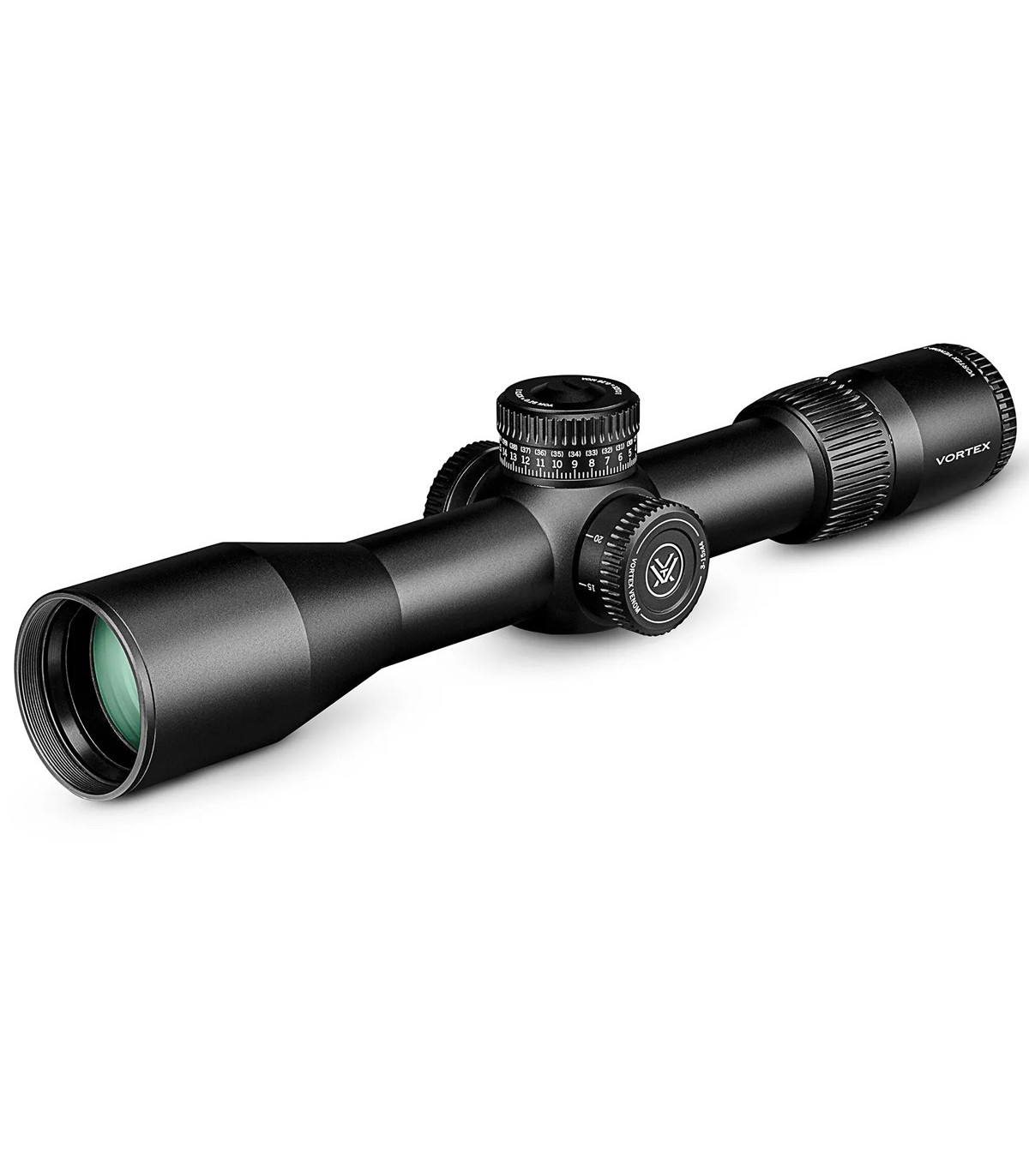 34mm aircraft-grade aluminum tube, anodized low-glare matte black finish 44mm objective lens XD optical system ArmorTek coating protects against oil, dirt, and scratches Exposed locking elevation turret Capped windage turret RevStop Zero System Elevation turret includes external rotation indicator 3-15X magnification system Eye relief: 3.7" Field of view: 42.4'-8.4' @ 100yds. Elevation range: 124 MOA, in 1/4 MOA increments Windage range: 75 MOA, in 1/4 MOA increments 25 MOA per turret revolution Parallax: 10 yards to infinity EBR-7C laser-etched MOA FFP reticle Fast-focus eyepiece Fogproof, shockproof Nitrogen purged, O-ring sealed Includes sunshade, lens cloth, throw lever, lens covers, 2mm hex wrench Length: 13.3" Weight: 28.8oz VIP Warranty, unlimited, lifetime, transferable