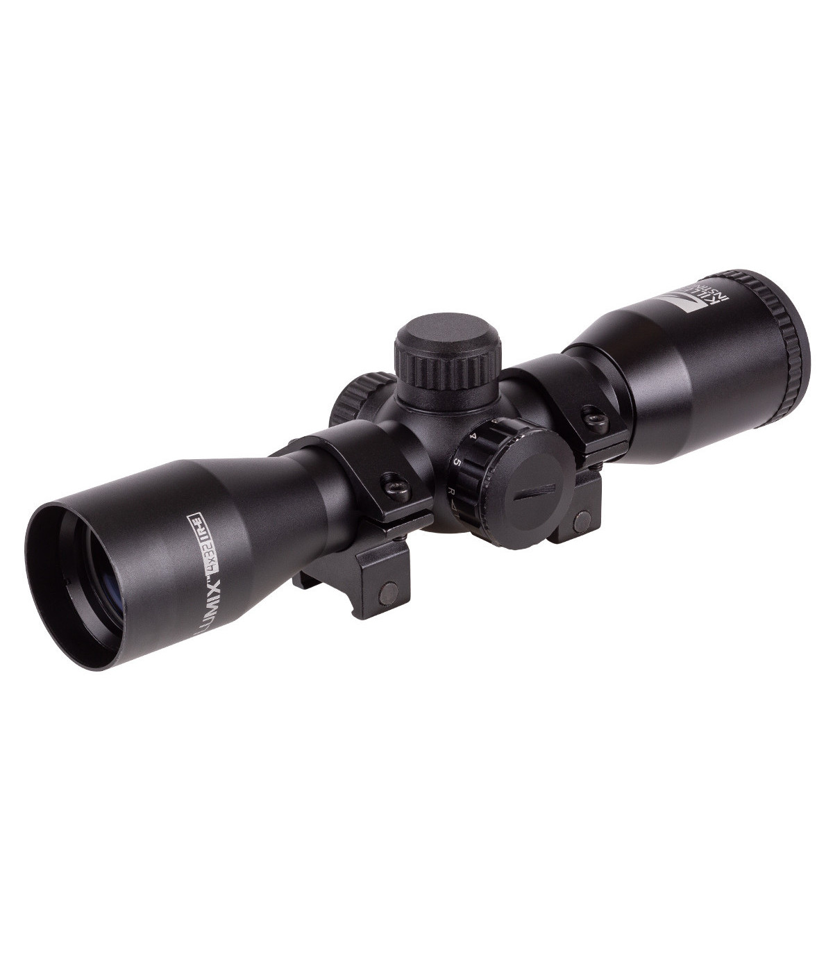 Designed for crossbows shooting above 300 FPS Etched glass reticle features multiple aiming points 1" mono-tube design Fast Focus eye-piece Red or blue illuminated reticle Multi-coated lenses Nitrogen purged Shock, Water, and Fog Proof Includes flip-up covers and weaver/picatinny rings
